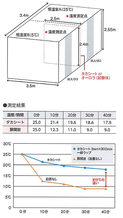 室内温度を25℃と5℃にして、25℃の室内のみ空調を停止し、扉を開放した場合と間仕切りシートを取り付けた場合の室内温度変化を測定。